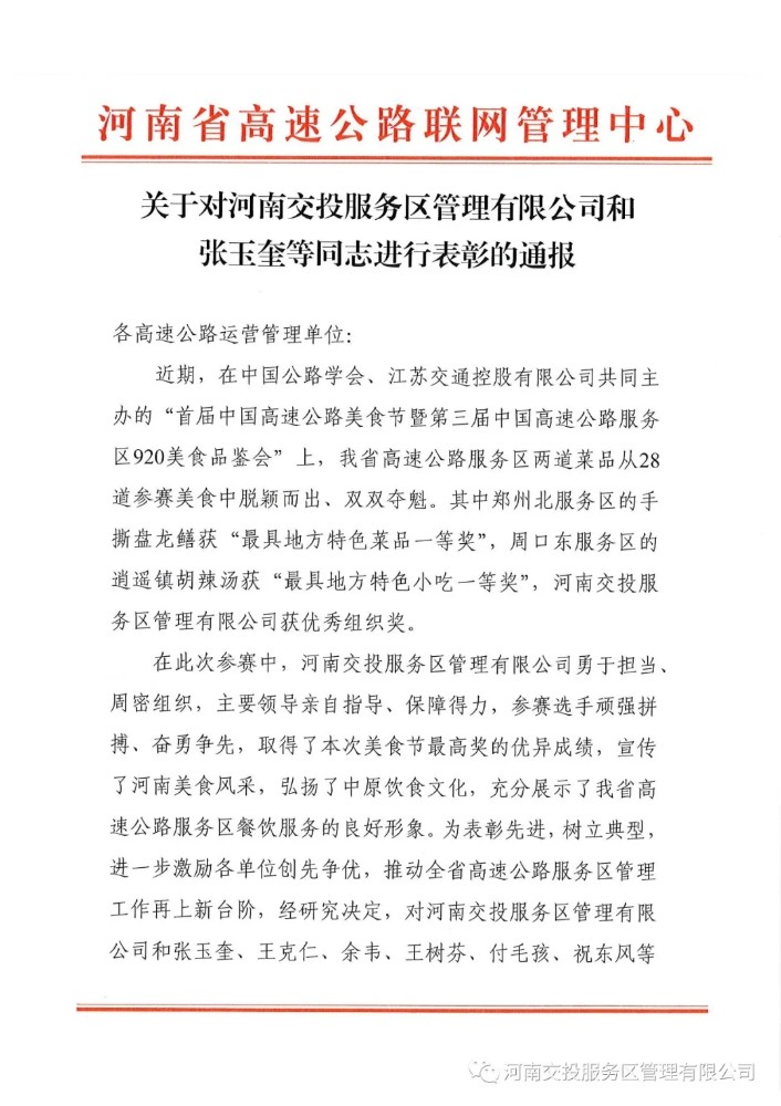 省高速公路聯網管理中心對公司勇于擔當、周密部署,參賽團隊團結一心、奮勇爭先,取得了本次美食節最高獎的優異成績,給予了充分肯定,并對服務區公司和張玉奎、王克仁等6名同志給予全省通報表彰!