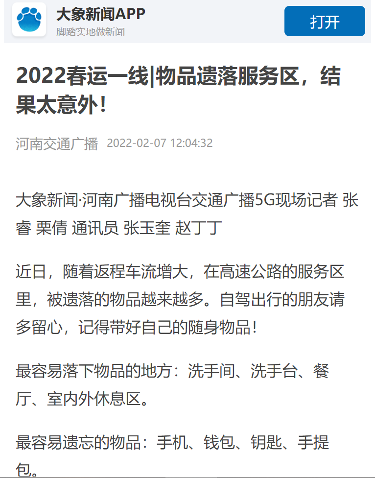 來源: 本站 發布時間: 2022-02-072月7日,“河南交通廣播”、今日頭條、“河南交通廣播”新浪微博官方號等媒體以“2022春運一線|物品遺落服務區,結果太意外!”為題,對公司所屬服務區春節期間溫馨服務進行宣傳報道。點擊原文:https://share.hntv.tv/news/0/1490536932762804226https://www.toutiao.com/i70…