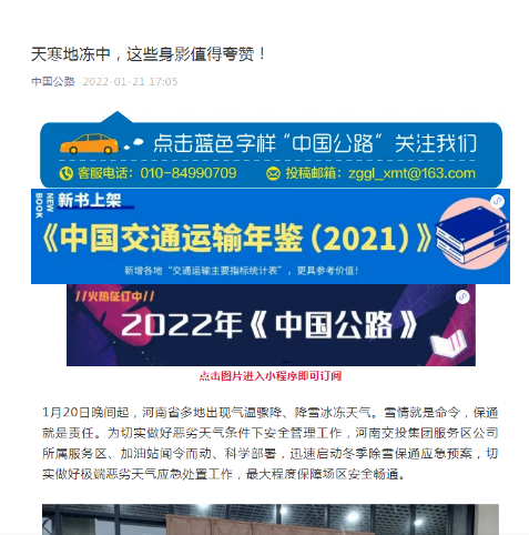 1月21日,“中國公路”微信公眾號 以“天寒地凍中,這些身影值得夸贊!”為題,對公司所屬服務區、加油站積極開展雨雪天氣防護工作進行了宣傳報道。網址:https://mp.weixin.qq.com/s/fr2d-9a02z-FJr7X5Qn1MA 截圖:1月21日,“中國公路網”以“以雪為令,除雪保暢 為公眾出行…